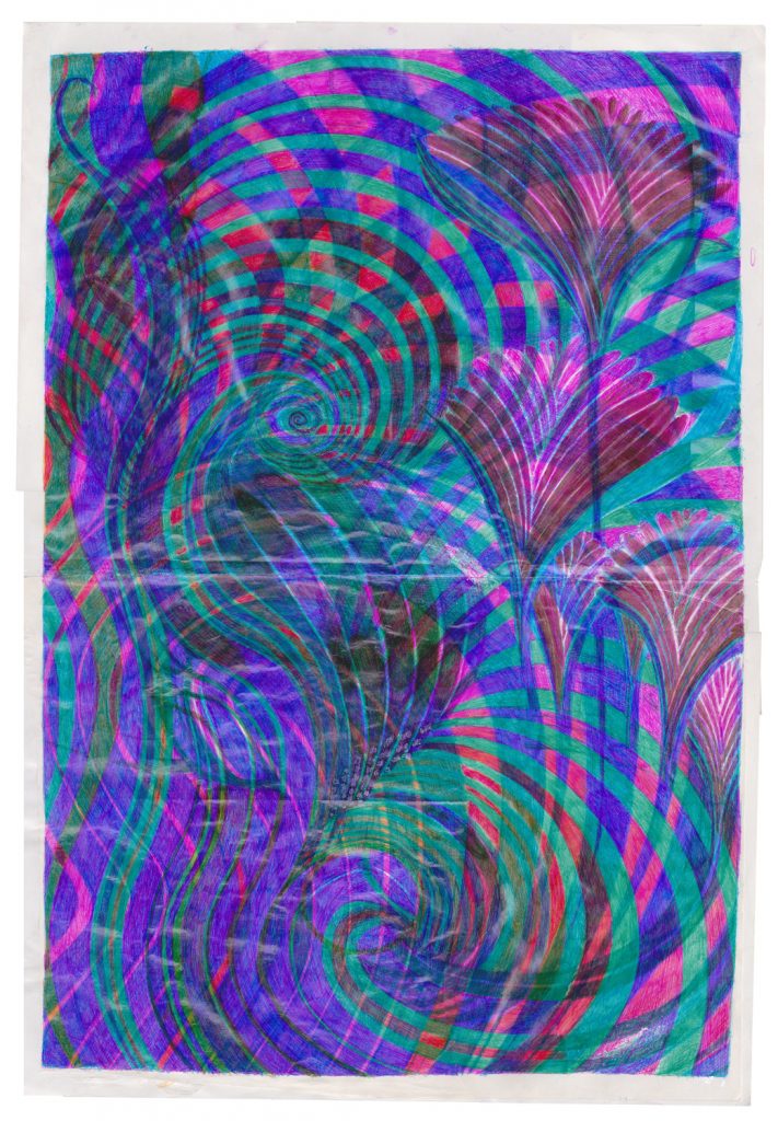 Les dessins hypnotiques et rythmés d’Anne Bourse (née en 1982) font écho aux compositions et aux superpositions de matières et de couleurs du couturier. L’artiste a souvent témoigné de son intérêt pour la mode et le textile, et de son admiration pour SAINT LAURENT.