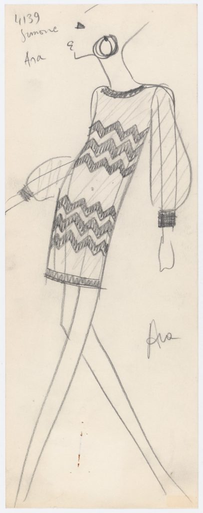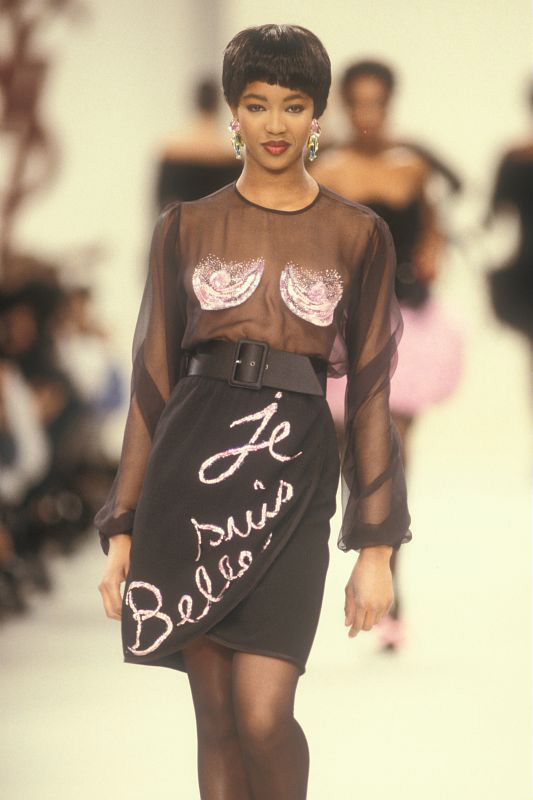 Nombreux sont les croquis préparatoires qui accompagnent la réflexion d’Yves SAINT LAURENT autour de la création du modèle « Je suis Belle » issu de la collection SAINT LAURENT rive gauche automne-hiver 1988. La phrase aux lettres brodées « Je suis Belle » apparaît comme une incantation conférant charme et force à la femme qui la porte. L’utilisation de l’écrit est rare chez Yves SAINT LAURENT, tout comme dans le monde de la mode, en cette fin des années 1980. Cet ensemble fut porté par Naomi Campbell (née en 1970) qui démarrait alors sa carrière de mannequin.