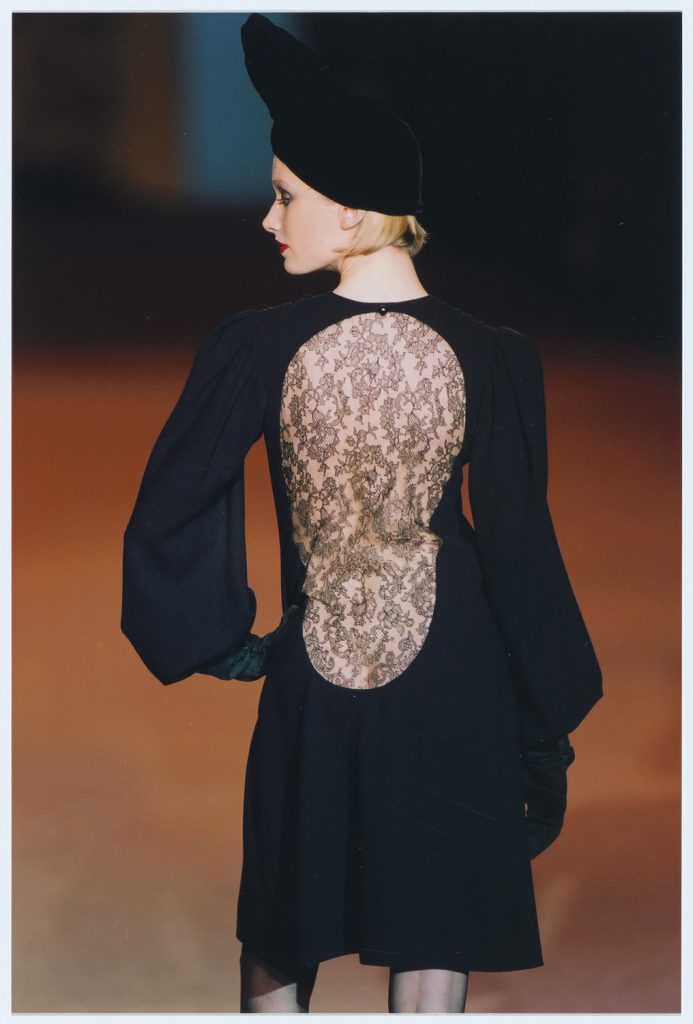 Cette robe du soir apparaît au premier abord très austère par son noir profond, ses manches longues et fluides, sa rangée de boutons noirs fermant son col très haut. Elle révèle pourtant toute sa sensualité dans le dos. Parée de dentelle, la femme qui la porte offre au regard sa peau, dans un jeu subtil et séduisant de caché-montré. Cette robe courte a été immortalisée par la photographie de Jeanloup Sieff (1933-2000), parue dans le numéro de Vogue (Paris) de septembre 1970 (présenté dans le grand salon). Dans un halo de lumière, Marina Schiano (1941-2019) dévoile, des épaules au bas des reins, son corps nu sous la dentelle de Chantilly de la maison Brivet. La pose du mannequin, la présence du turban, le dévoilement du corps féminin rappellent la célèbre photographie de Man Ray (1890-1976) Le Violon d’Ingres (1924), figurant Kiki de Montparnasse (1901-1953) nue.