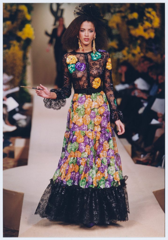 Les modèles du soir du défilé haute couture printemps-été 2000 sont inspirés des « robes-gitanes ». Les mannequins apparaissent parés de fleurs dans les cheveux et tenant un porte-cigarettes à la main. Cette robe est composée d’une jupe à volants, très ample, en mousseline de soie imprimée de roses multicolores. Le volant est constitué d’une dizaine de mètres de dentelle noir irisé de la maison Marescot, donnant du volume et de la tenue comme sur les jupes des danseuses de flamenco.