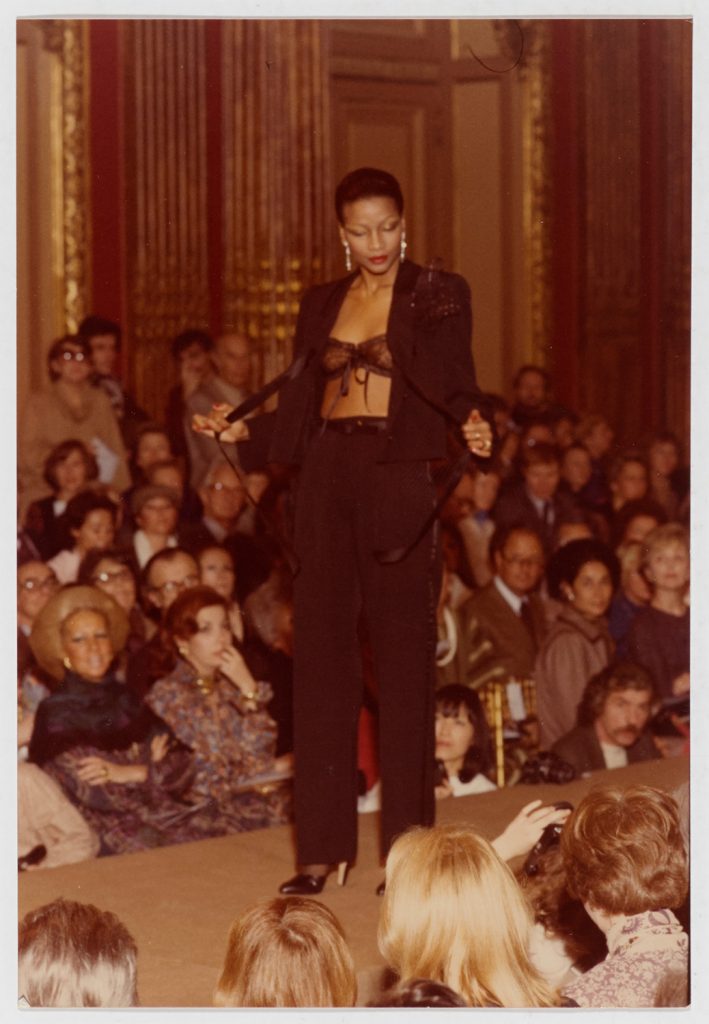 Vêtement iconique du vestiaire créé par Yves SAINT LAURENT, le smoking trouve une nouvelle jeunesse dans le défilé du printemps-été 1978. Il est présenté pour la première fois en 1966, de manière classique et féminisée, sur une chemise à jabot en batiste de coton blanc, puis en version bermuda sur une blouse de Cigaline® entièrement transparente ; il est ici associé à un simple soutien-gorge de dentelle de Chantilly laissant la peau du mannequin apparente. Comme en témoignent les applaudissements retentissants dans la salle lors du passage du modèle sur le podium, ce dernier marque les esprits. Le dessous, devenu dessus, est le manifeste d’une sensualité exacerbée de la femme qui le revêt tout en arborant le pouvoir conféré par un tel ensemble. Les rubans qui l’ornent et volent au vent au fil des déambulations y ajoutent une touche de sensualité hypnotisant l’auditoire.