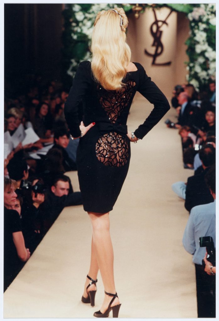 En 1996, le mannequin Karen Mulder (née en 1970) incarne de nouveau cette esthétique des années 1940 par sa coiffure travaillée en coques et par son maquillage aux lèvres rouges bien définies. La robe, très sobre de face, présente une tout autre vision, intrépide et insolente dans le dos. Yves SAINT LAURENT réitère ici le traitement audacieux de la robe dos nu de l’automne-hiver 1970, immortalisée sous l’objectif de Jeanloup Sieff, en la rendant encore plus sensuelle par sa découpe et par la dentelle utilisée qui laisse davantage apercevoir le corps du modèle.