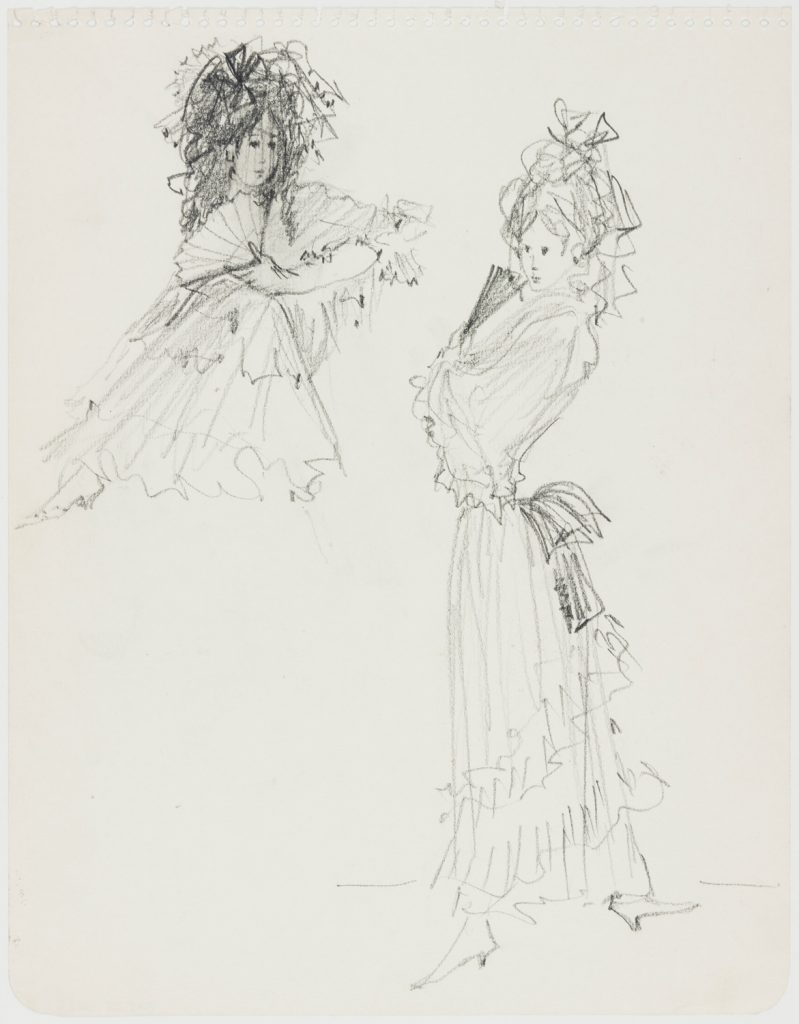 Ces carnets de croquis, ainsi que les feuilles qui en sont issues, témoignent des études du couturier pour des projets annexes à ses collections de mode. Ceux-ci ont été réalisés dans le cadre des recherches autour de la pièce de théâtre Le Mariage de Figaro, mise en scène par Jean-Louis Barrault à l’Odéon théâtre de l’Europe en 1964 ou encore pour le ballet Le Diable amoureux, projet resté inachevé. Comme l’attestent les annotations sur les couvertures des carnets, « Le Mariage de Figaro Goya » sur l’un et « Goya Espagne XVIIIème » sur l’autre, ces dessins sont inspirés du peintre espagnol qu’Yves Saint Laurent admire et dont il acquiert, avec Pierre Bergé, un tableau, Portrait de Luis María de Cistué y Martínez (1791), au début des années 1980.