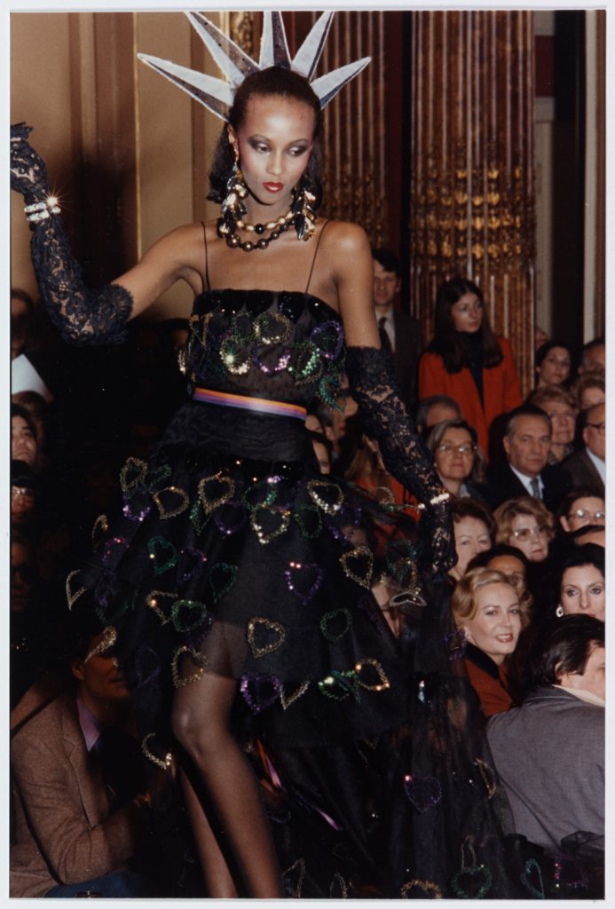 Lors du défilé de la collection haute couture printemps-été 1980, c’est le mannequin Iman qui porte ce modèle. Cette robe bustier à traîne de tulle noir, brodée de cœurs, est complétée par un imposant diadème à cinq branches, proche de celui de la Statue de la Liberté de New York. Le mannequin déambule sur le podium, en jouant avec un porte-cigarettes. Cet accessoire accentue l’idée de liberté et de légèreté, émanant de cette tenue de soirée. Ce sont de chaleureux applaudissements du public qui accueillent cette robe : elle célèbre avec majesté la femme et rejoint parfaitement l’univers d’Yves SAINT LAURENT par la présence du motif de cœurs.