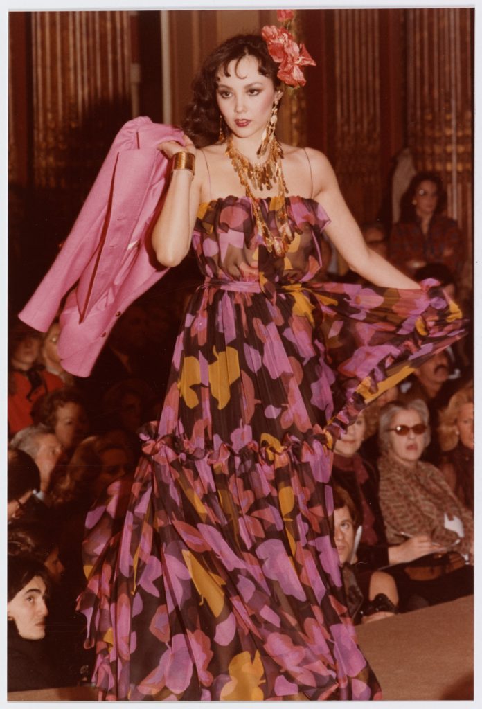 Plusieurs ensembles du soir composés de caraco de couleur unie et de robe à fines bretelles aux motifs répétés et colorés rythment le défilé de la collection haute couture printemps-été 1980. Cette robe de mousseline imprimée de motifs de fleurs en fait partie. Sur le podium, les mannequins présentent ces modèles à l’aide d’amples mouvements : reines d’élégance, elles font virevolter leurs robes de mousseline, telles des danseuses. La légèreté et la fluidité du tissu sont l’occasion d’éblouir, presque d’ensorceler le public qui assiste au défilé.